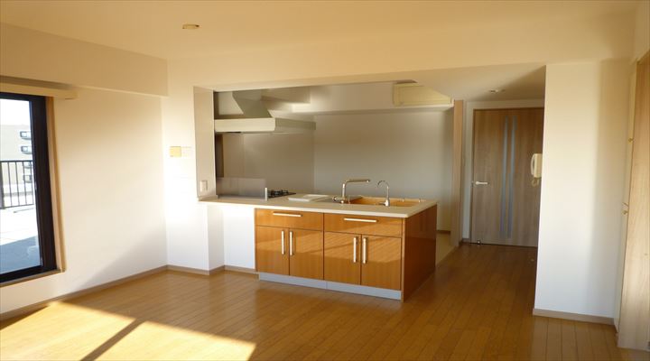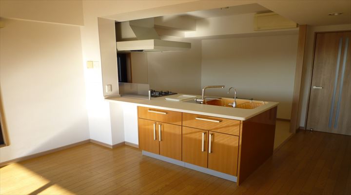 対面式のキッチンでしたが閉鎖的な空間でした。 間仕切り壁をすべて撤去して、カウンター幅の広いフラット対面に変更しました。