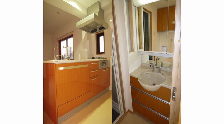 システムキッチン:ヤマハ ベリー ユニットバス:INAX リノビオ 洗面器:ヤマハ アフィットC 洗濯機上吊戸棚:ヤマハベリー 建具:パナソニック電工