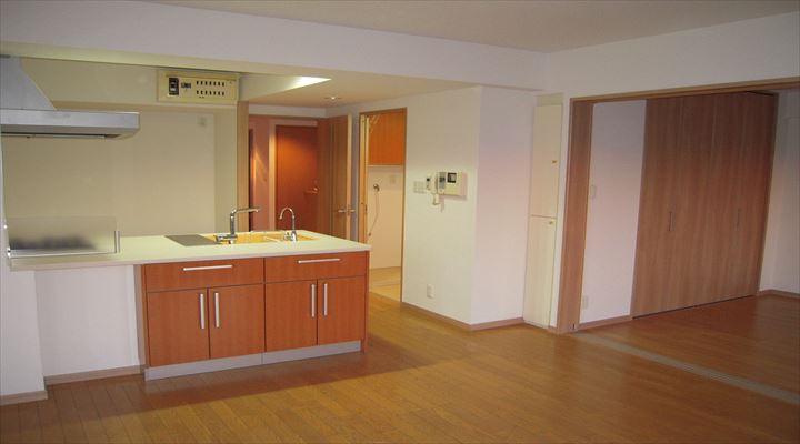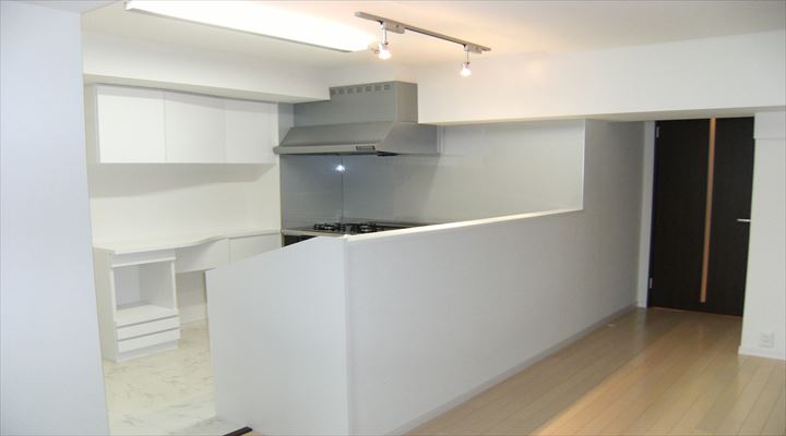 LDKを対面型キッチンに変更。 壁は白をベースに松下電工製建具(ダークセピア色)を取付ました。 株式会社GAUDI Produce |